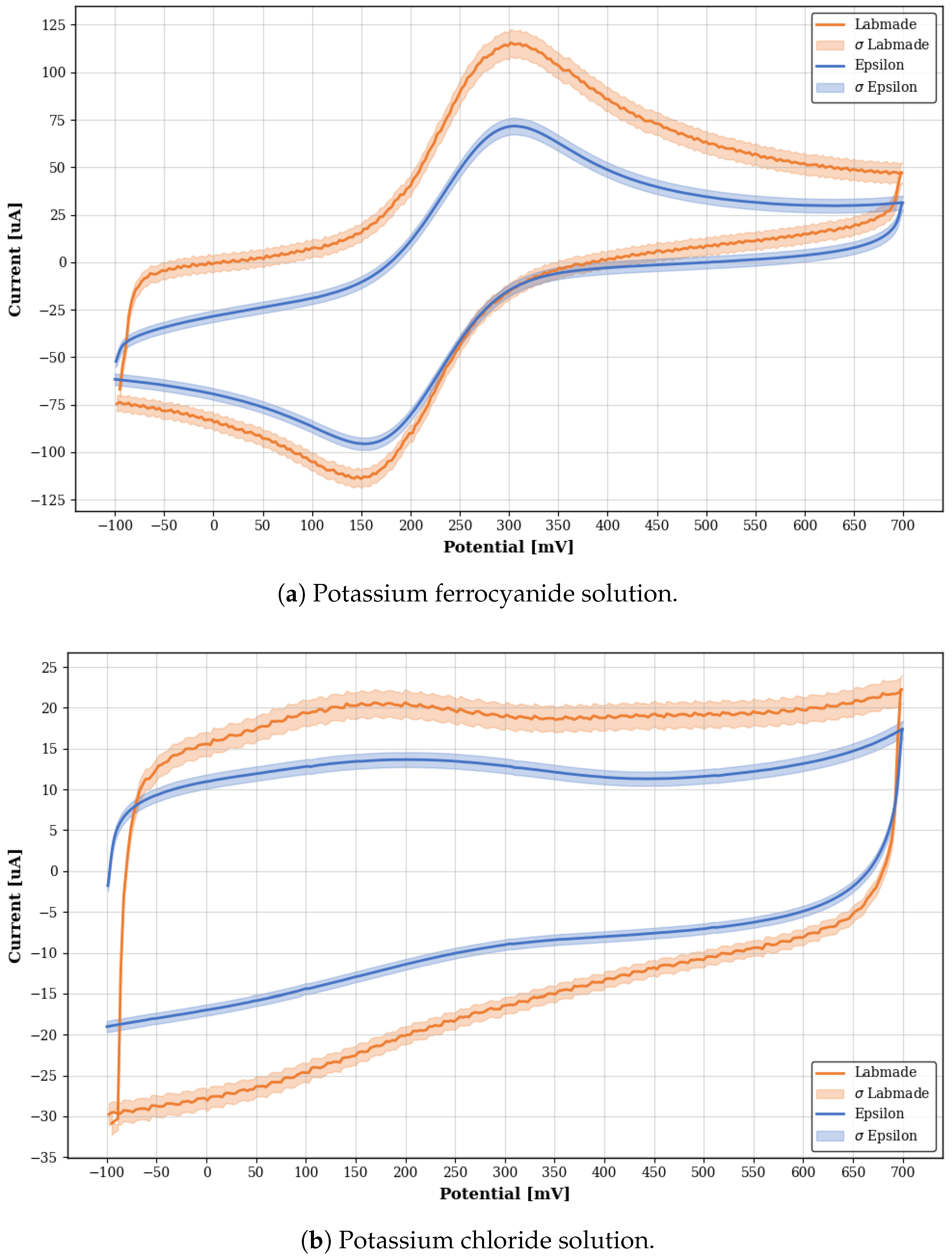 Pattern solutions mean voltammograms using cyclic voltammetry technique. Orange curve represents the lab-made equipment response, meanwhile the blue curve represents the Commercial equipment response. Each color shading represents the standard deviation for each curve.