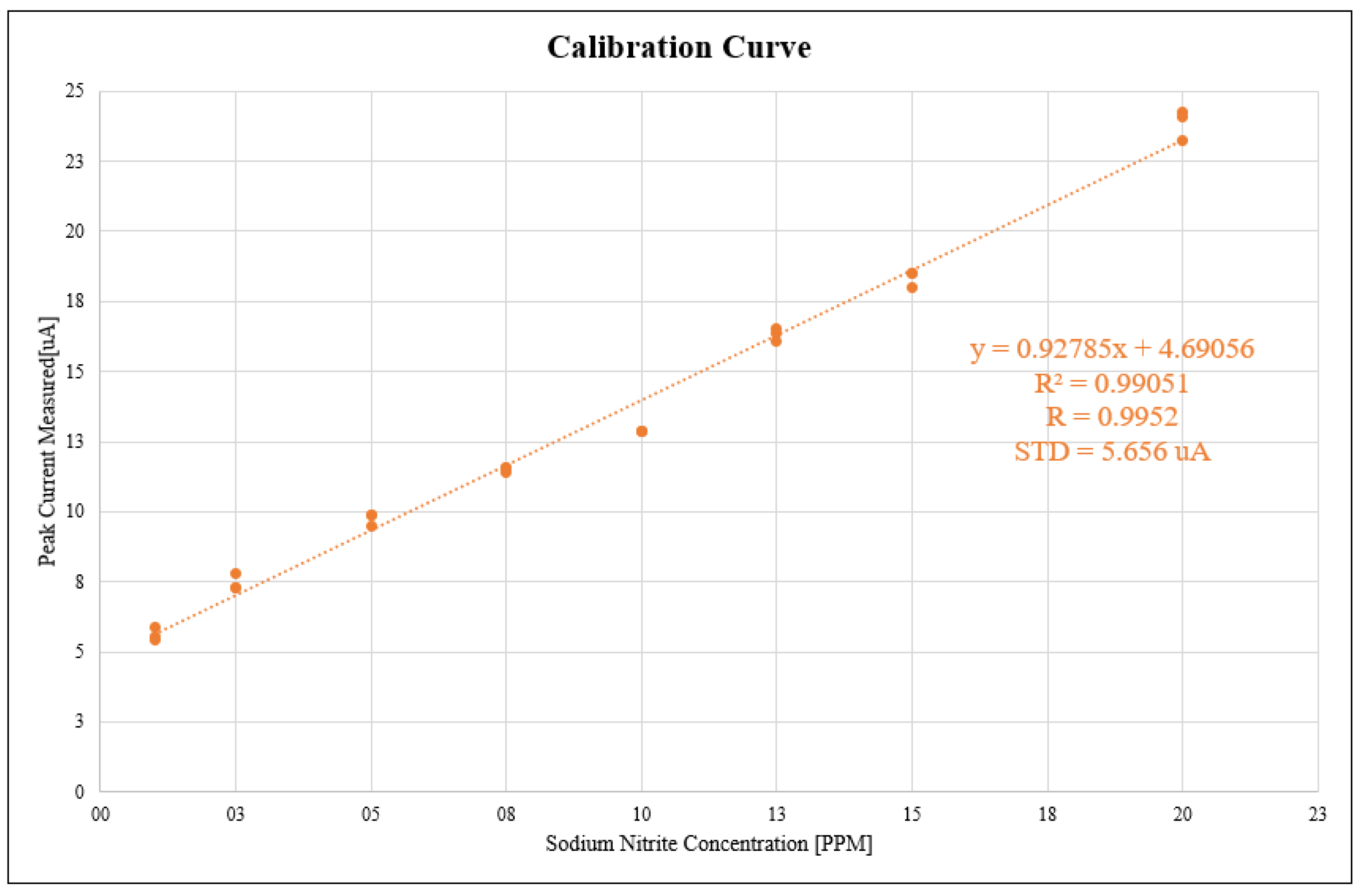 | Sample | Peak Current Measured [µA] | Proposed Method [ppm] | Reference Method [ppm] | Difference [%] |