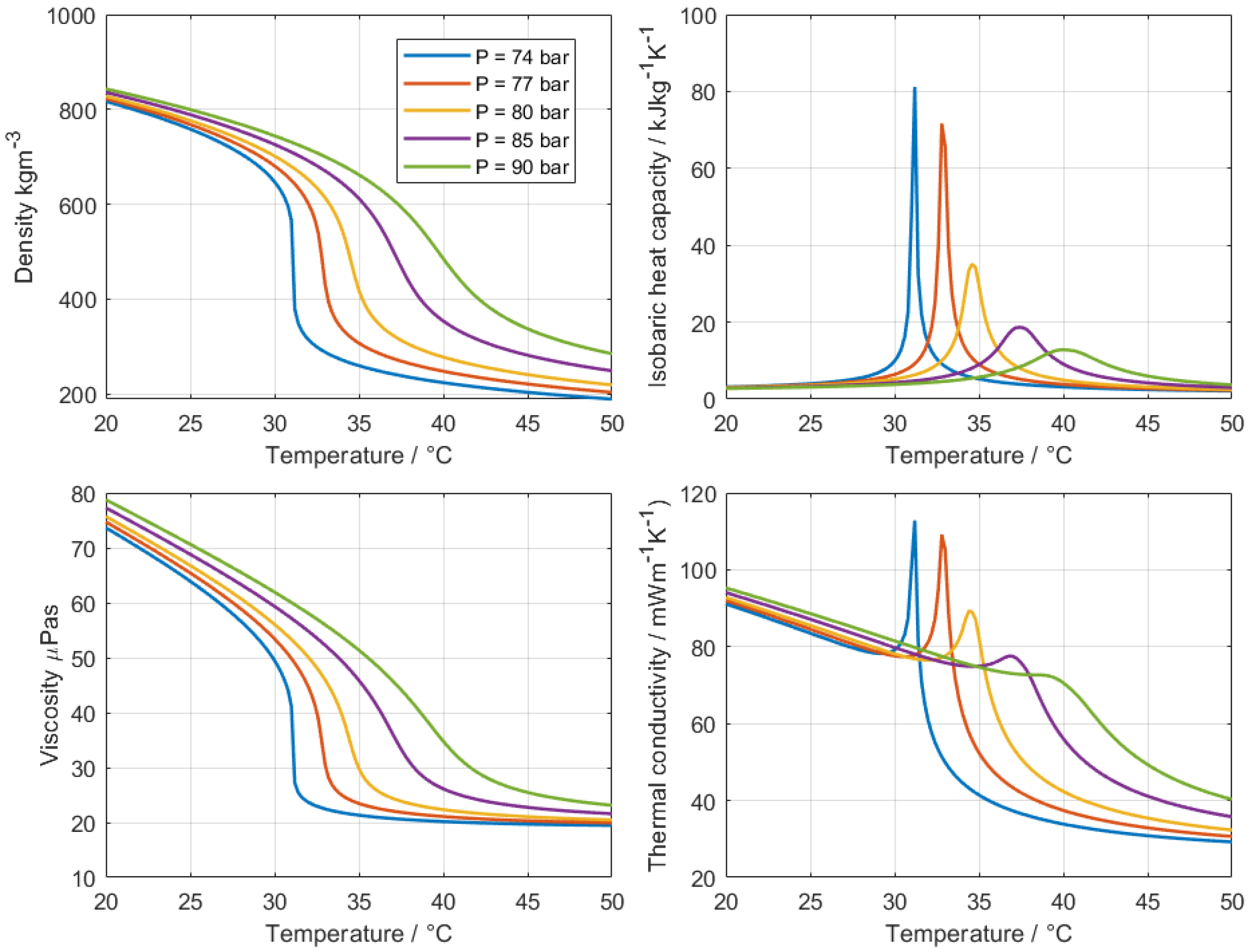 Figure 1 shows the variation in density, heat capacity, viscosity, and thermal conductivity with temperature at different pressures. The critical point of CO
