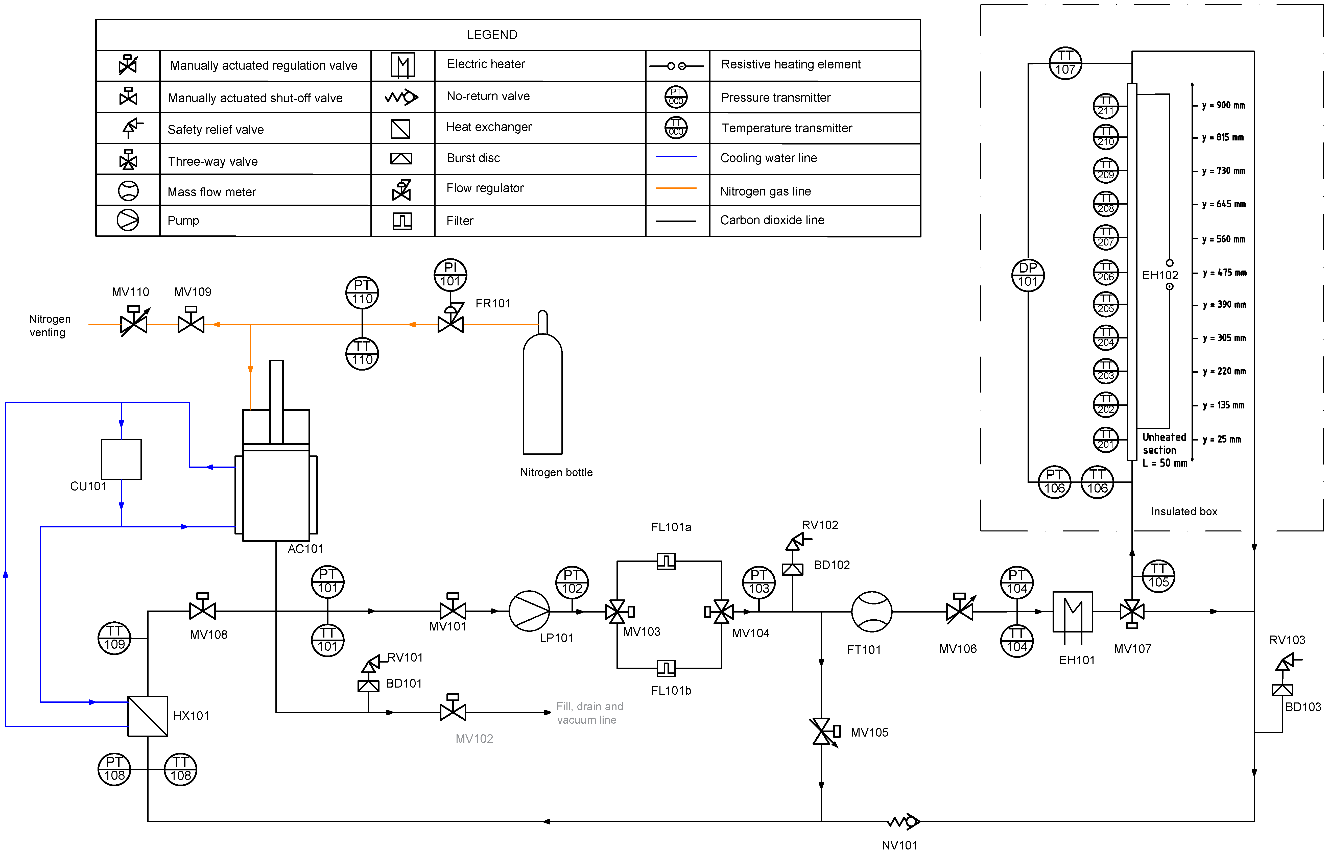 To operate the test rig, firstly an initial operating pressure is chosen and set with FR101. The pump LP101 can then be started to set a stable operating condition. After equalization of temperatures, depending on the initial state, the pressure will have changed and can be readjusted to its desired value in PT106 by means of opening MV110. The mass flow can also be adjusted to the value of interest using MV105. Heaters EH101 and/or EH102 will then be used depending on the nature of the tests to be carried out. This is done by means of LabVIEW software, which can be found in the