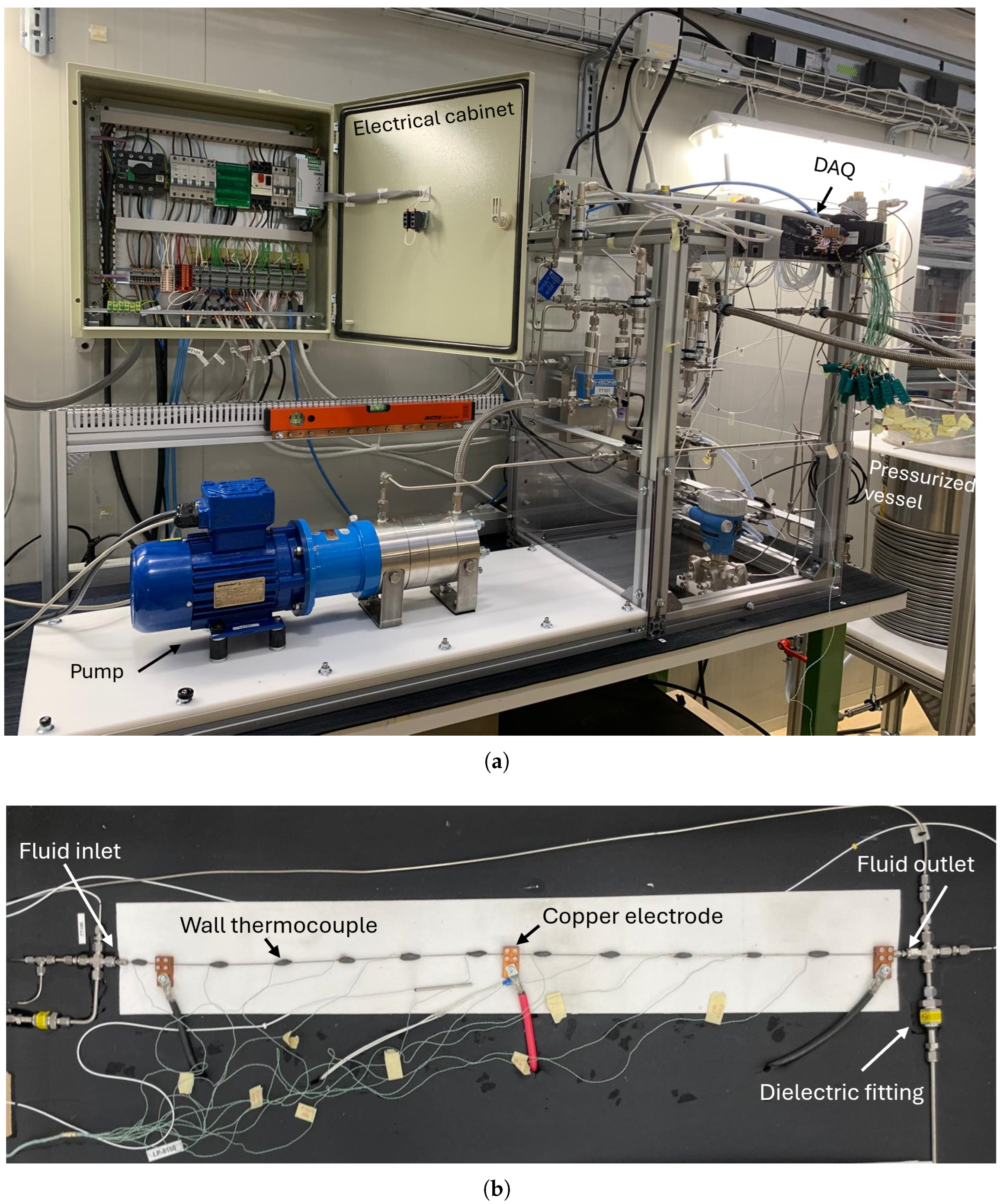 After this, the fluid enters the test section, which consists of a 1 m long stainless-steel (304L) capillary with an inner diameter of 1.00 mm and outer diameter of 1.59 mm. Resistive heating is applied via clamped electrodes (EH102), powered by a DC power supply. To avoid parasitic current leakage, dielectric fittings are placed at both ends of the test section. Up- and downstream adiabatic segments ensure flow development prior to the heated zone.