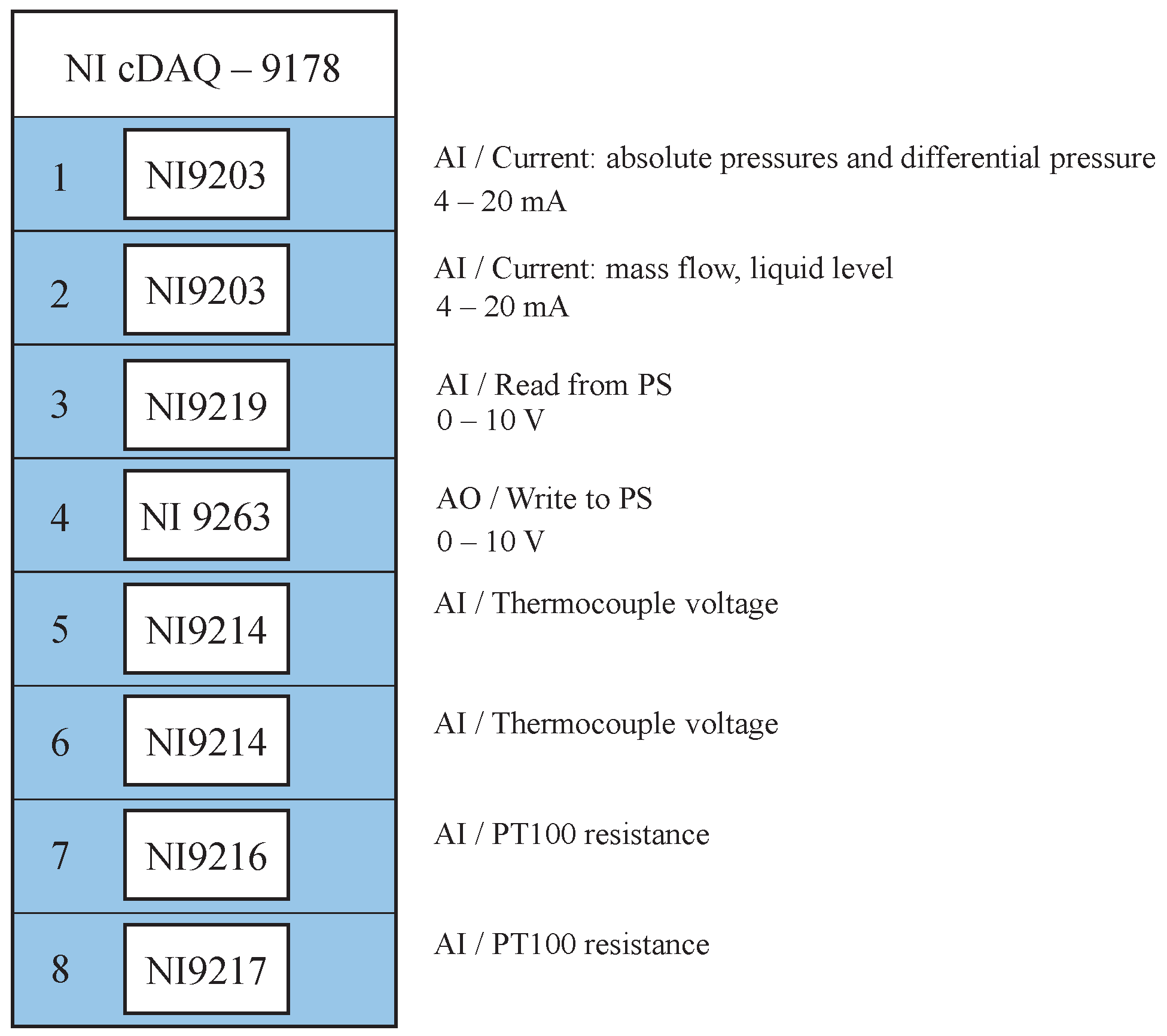 Data acquisition and control are handled using National Instruments (NI) hardware and custom LabVIEW-based software (version 24) for process control and logging. Process signals and parameters are collected in a cDAQ-9178, which forms the heart of the monitoring system.