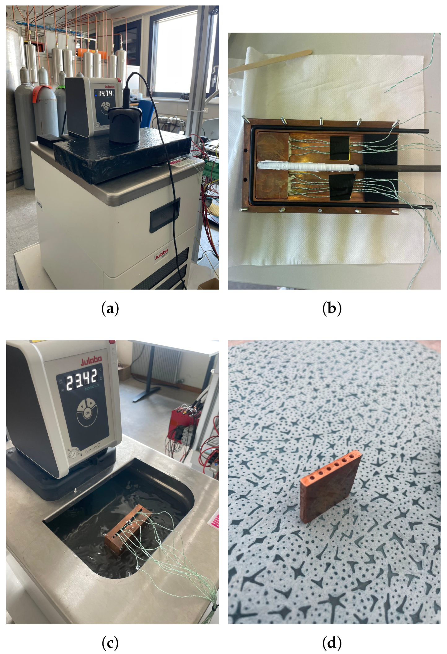 A steady-state point is considered only when the temperature variation at each sensor remains within K for a period of five minutes, ensuring negligible transient effects. This threshold is well below the absolute uncertainty of the temperature sensors and confirms thermal stability during each measurement point. At the moment, due to the nature of the software, the acquisition rate is fixed at 1 Hz; however, it is planned to remove this constraint in the future.