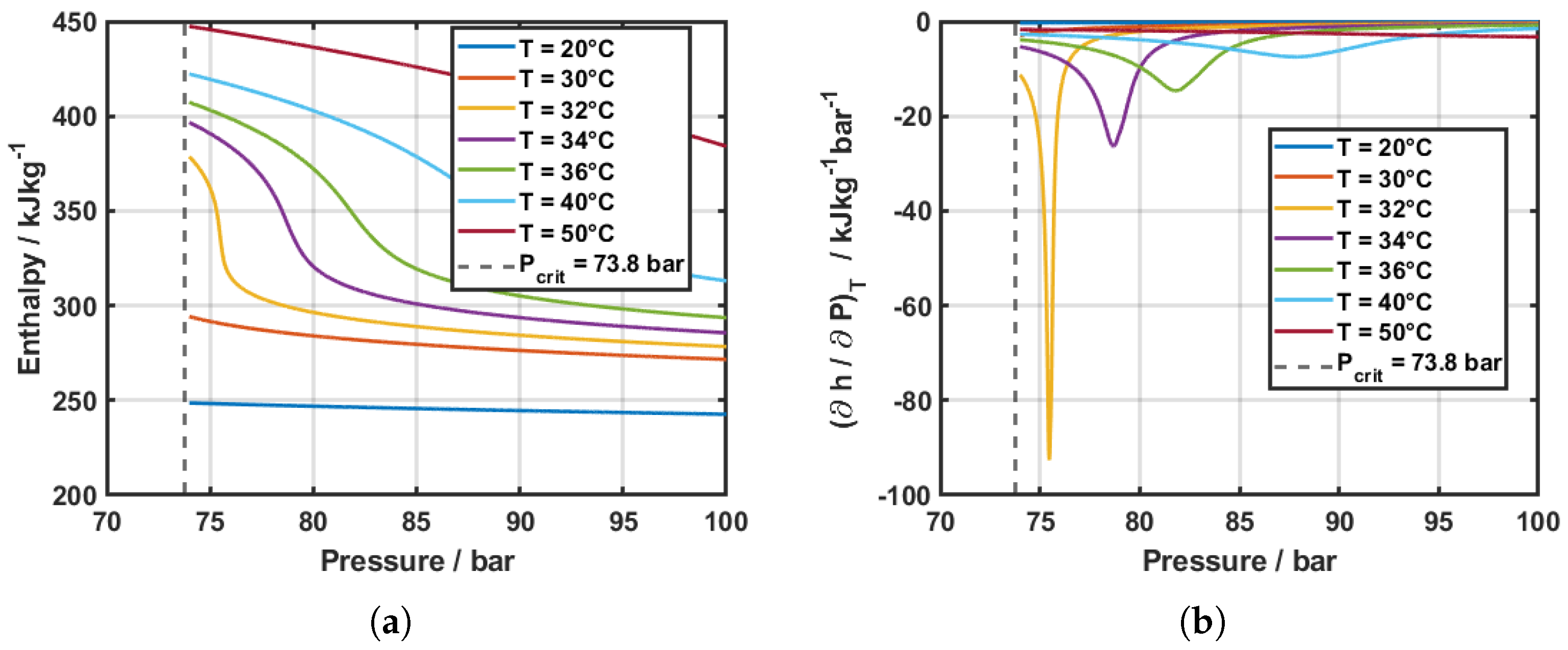 Figure 7a shows the pressure–enthalpy diagram of carbon dioxide above the critical point. It can be seen that the variation in enthalpy is strongly dependent on temperature at pressures above the critical value. This variation becomes increasingly large at temperatures close to the pseudo-critical temperature at a fixed pressure value. This can be seen for the point at approximately