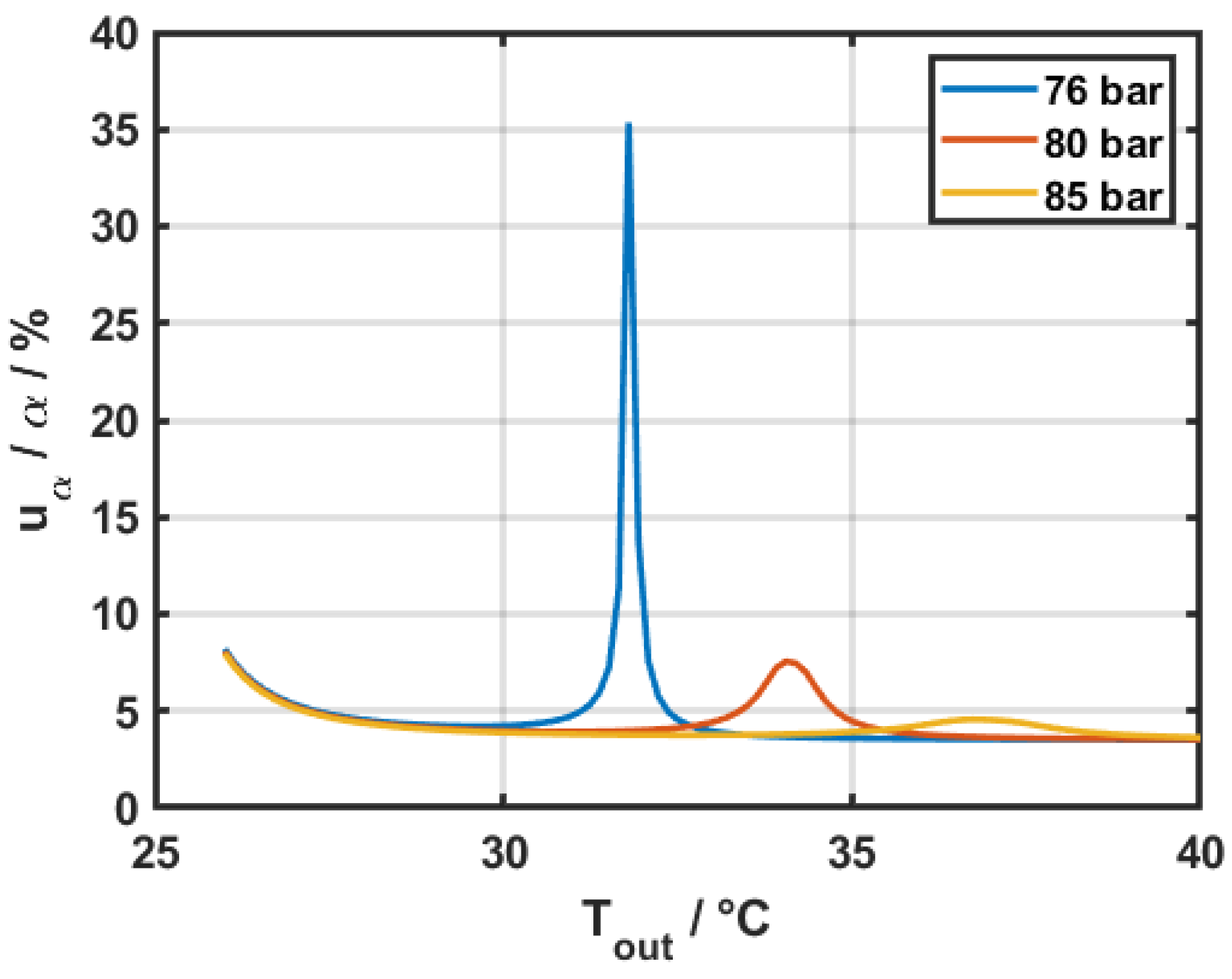bar, where the inflection point at 32 °C corresponds to the pseudo-critical temperature. On the right,