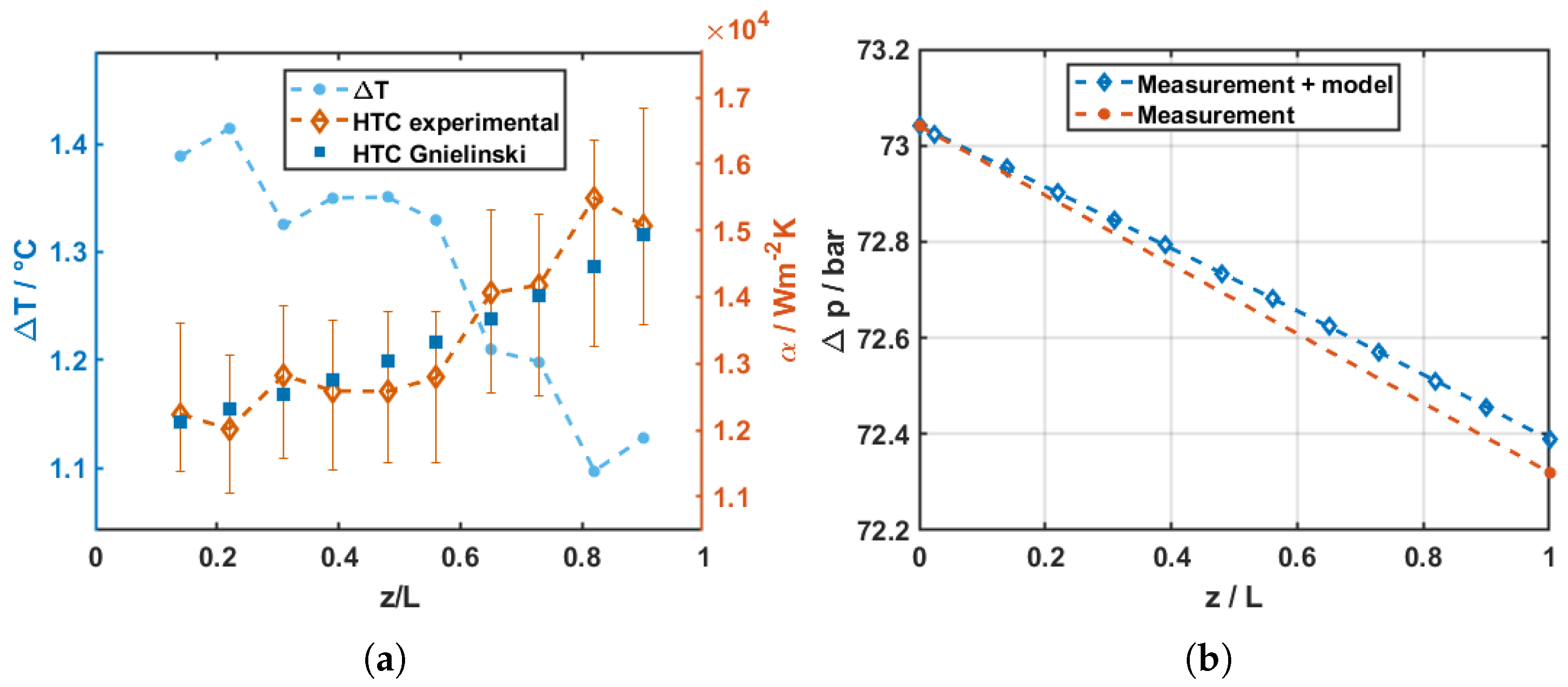 Figure 9 shows the measured wall-to-bulk temperature difference along the heated section, together with the resulting experimental heat transfer coefficient profile. For comparison, heat transfer coefficients were evaluated using the Gnielinski correlation. The data reduction procedure is that specified in