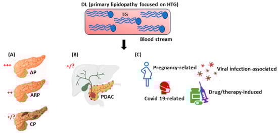 DL, while less commonly discussed, not only plays a significant role in the development of pancreatitis but also contributes to pancreatitis severity after the onset [7,8,9,10,11]. Common etiologies of DL include obesity and metabolic syndromes, lipid storage diseases, pregnancy, acute infections, and drug-induced disorders of lipid metabolism [12,13,14,15,16]. In this review, we delve into the complex interplay of these two entities through a discussion of DL pathophysiology with emphasis on HTG, the role of DL in the three types of pancreatitis (AP, ARP, and CP), how DL contributes to the development of pancreatic cancer (specifically, PDAC), and some of the unique clinical scenarios of DL-associated pancreatitis (Figure 1). The final section of this paper summarizes current therapies in use to treat HTG.