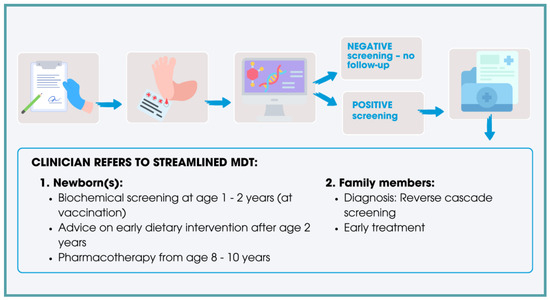 Universal, genetic newborn screening is currently under review in Queensland and models of care for the follow-up of neonates (and their family members) diagnosed with FH are currently being reviewed. This may include multidisciplinary lipid clinics with close collaboration of primary, secondary, and tertiary caregivers. A possible workflow for genetic newborn screening is summarised in Figure 1. However, the pathways of care require careful consideration, the definition of risk reduction pathways, and the involvement of all stakeholders prior to introduction.