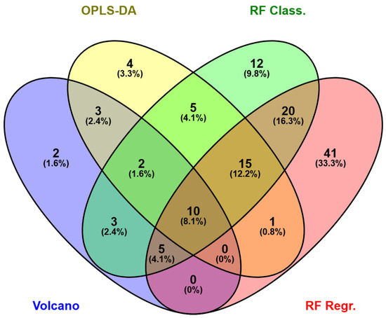 Key features highlighted by the different approaches are compared using a Venn diagram (Figure 3). RFreg and RFclass yielded the largest number of unique molecules (respectively, 41 and 12 molecules, i.e., 33.3% and 9.8% of the total), while only four variables were exclusive to OPLS-DA (3.3% of the total), and two variables were detected only by volcano analysis (1.6%). Ten variables were common for all four approaches (8.1%). The comparison between classification (volcano, OPLS-DA and RFclass) and regression approaches (RFreg) shows that 51 (41.5% of the total) molecules (out the 92 considered important and highlighted by RFreg) were common with one of more of the models here evaluated. This, again, indicates that there was a large consensus between the GVF and the classification criteria used to define the two BMO groups.