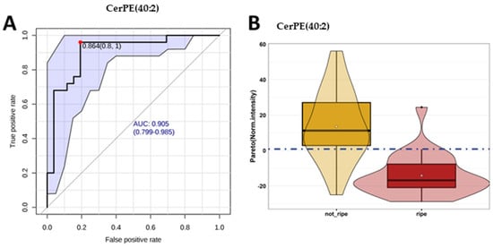 Receiving operating characteristic (ROC) curves and area under the curve (AUC) for CerPE(40:2). (A) ROC curve reporting the AUC, the 95% CI for AUC, and the cut-off threshold with values of sensitivity and specificity; the diagonal line marks a 0.5 AUC (no effect). (B) Boxplot reporting the Pareto-scaled variable distribution, with the blue horizontal intercept indicating the cut-off point; the box includes the observation between the 1st (25th percentile) and 3rd (75th percentile) quartile, the whiskers represent values between ±1.5 × interquartile range (IQR), observations over ±1.5 × IQR are reported as outliers (black dots), and violin shapes represent the variable distribution. (A) Computed and plotted via ‘MetaboAnalystR’ []; (B) plotted via ‘ggplot2’.