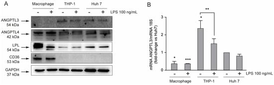 THP-1-derived macrophages do not express ANGPTL3. (panel (A) THP-1 cells were seeded in 6-well trays (2.9 × 106 cells in 3 mL/well of RPMI) in the presence of 10% FCS and 320 nM PMA. After 72 h, Huh7 and THP-1 cells were seeded (5.0 × 105 Huh7 cells in 3 mL/well of MEM and 9 × 106 cells in 3 mL/well of RPMI) 10% FCS) in the presence of 10% FCS, and the medium of PMA-treated THP-1 was replaced with fresh RPMI. After 24 h, cells were treated with LPS 100 ng/mL. To determine protein levels, Western blot analysis, with indicated primary antibodies, was performed after 24 h of incubation with LPS. Antibody anti-GAPDH was utilized as the loading control. (panel (B)) To determine mRNA levels, RT-qPCR was performed after 24 h of incubation with LPS on total RNA samples. The symbols – and + indicate the absence or presence of LPS, respectively. Data are presented as mean ± SD of three different experiments. * p < 0.05, *** p < 0.001 vs. Huh7, ** p < 0.05 vs. THP-1.