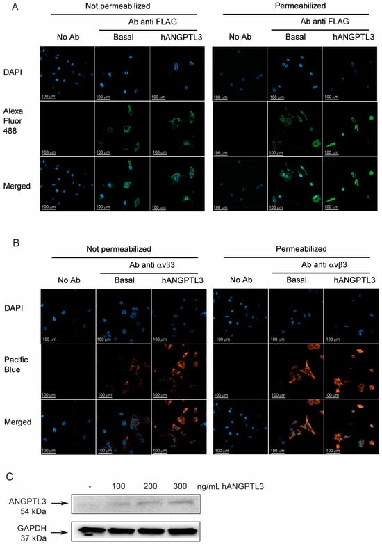Exogenous ANGPTL3 is internalized by THP-1-derived macrophages. THP-1 cells were seeded in 24-well trays (106 cells/well in 1.5 mL/well of RPMI) in the presence of 10% FCS and 320 nM PMA to differentiate into macrophages. After 72 h, the medium was replaced with fresh RPMI with 0.5% bovine serum albumin (BSA). The day after the cells were treated with hANGPTL3 100 ng/mL for 24 h, immune cytochemistry (ICC) was performed with antibody anti-FLAG recognizing the exogenous ANGPTL3 (panel (A)) and anti-αvβ3 antibody (panel (B)), with and without cell permeabilization. DAPI was used to stain cell nuclei. (panel (C)) Western blot analysis with antibody anti-ANGPTL3 of total protein extracts of THP-1-derived macrophages incubated with hANGPTL3 for 24 h at indicated concentrations. Antibody anti-GAPDH was utilized as the loading control. Blue: DAPI. Green: Alexa Fluor 488 anti-FLAG-tag ANGPTL3 antibody (anti-DDDDK antibody). Orange: Pacific Blue anti integrin αvβ3 antibody. The symbols – indicates the absence of hANGPTL3.