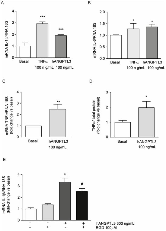 ANGPTL3 produces an inflammatory response in THP-1-derived macrophages. (panels (A–E)) THP-1 cells were seeded in 48-well trays (2.5 × 105 in 300µL/well of RPMI) in the presence of 10% FCS and 0.32 µM 320 nM PMA to differentiate into macrophages. After 72 h, the medium was replaced with fresh RPMI with 0.5% BSA. The day after, the cells were stimulated with TNFα 10 ng/mL or hANGPTL3 100 ng/mL (panels (A–C)) or with hANGPTL3 100 ng/mL in the presence or absence of RGD peptide (panel (E)) for 24 h. The mRNA levels were then determined by RT-qPCR. (panel (D)) THP-1 cells were seeded in 6-well plates (2.9 × 106 cells/well in 2 mL of RPMI) in the presence of 10% FCS and 320 nM PMA to differentiate into macrophages. After 72 h, the medium was replaced with fresh RPMI with 0.5% BSA. The day after, the cells were treated with hANGPTL3 100 ng/mL for 24 h, and TNFα levels were determined by a commercially available ELISA kit. Data are presented as mean ± SD of three different experiments. * p < 0.05, ** p < 0.01, *** p < 0.001 vs. basal, # p < 0.05 vs. hANGPTL3.