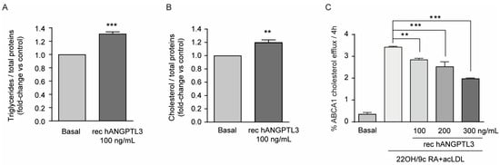 ANGPTL3 induces lipid accumulation and reduces cholesterol efflux in THP-1-derived macrophages. (panel (A,B)) THP-1 cells were seeded in 6-well plates (2.9 × 106 cells/well in 2 mL of RPMI) in the presence of 10% FCS and 320 nMPMA to differentiate into macrophages. After 72 h, the medium was replaced with fresh RPMI with 0.5% BSA. The day after, the cells were treated with hANGPTL3 100 ng/mL for 24 h, and triglyceride and cholesterol contents were determined after Folch’s lipid extraction with a commercially available kit. (panel (C)) Fully differentiated human THP-1 macrophages were radiolabeled for 24 h with 2 μCi/mL of 1,2-3H-cholesterol in RPMI + 2.5% FCS in the presence or absence of hANGPTL3 100–300 ng/mL. Then, the cells were treated for 18 h with a solution of RPMI supplemented with 0.2% w/v BSA in the presence or absence of LXR/RXR agonists, 22-OH 5 µg/mL and 9cRA 10 µM, and 25 μg/mL of acLDL in the presence/absence of hANGPTL3 100–300 ng/mL. Efflux was promoted for 4 h to apoA-I and expressed as the percentage of 1,2-3H-cholesterol released in the culture medium over the total radiolabeled intracellular cholesterol. Data are presented as mean ± SD of three independent experiments: ** p < 0.01, *** p < 0.001 vs. basal.