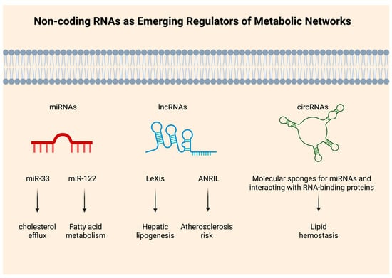 In parallel with the growing understanding of lipid metabolism, the past decade has witnessed advances in the understanding of genome regulation, particularly regarding non-coding RNAs (ncRNAs) [17]. MicroRNAs (miRNAs), long non-coding RNAs (lncRNAs), and circular RNAs (circRNAs), as ncRNAs, are now recognized as crucial regulators of gene expression at the epigenetic, transcriptional, and post-transcriptional levels [18,19,20]. Studies have demonstrated that ncRNAs modulate various aspects of lipid metabolism, including fatty acid synthesis and oxidation, cholesterol homeostasis, and lipid droplet dynamics [21]. For example, specific miRNAs such as miR-33 and miR-122 have been shown to regulate cholesterol efflux and fatty acid metabolism, respectively [22]. LncRNAs, through diverse mechanisms involving chromatin remodeling, transcriptional interference, and miRNA sponging, also exert profound effects on lipid metabolic pathways [23]. lncRNA-LeXis modulates hepatic lipogenesis by sequestering the transcriptional coactivator Med1 [24], or lncRNA-ANRIL is associated with atherosclerosis risk [25]. CircRNAs add an additional layer of complexity by acting as molecular sponges for miRNAs, interacting with RNA-binding proteins, and potentially encoding functional peptides [26]. Beyond intracellular roles, ncRNAs mediate inter-organ communication via exosomes, e.g., adipocyte-derived miR-99b suppresses hepatic FGF21 expression, exacerbating metabolic syndrome [27]. Therapeutically, ncRNAs offer promise due to their tissue-specificity and modularity, with antisense oligonucleotides and CRISPR-based editing in preclinical testing [28]. However, challenges such as limited delivery efficiency and off-target effects persist [29]. In this regard, we summarize recent studies to understand the crosstalk between ncRNAs and the regulatory networks that control lipid metabolism, and how these networks become dysregulated in chronic disease.