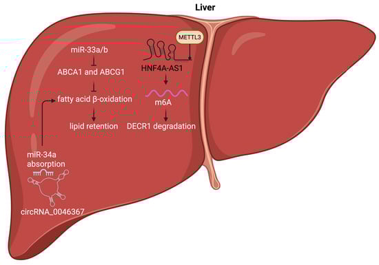 The liver orchestrates lipid homeostasis through hierarchically organized ncRNA networks that precisely control synthesis, oxidation, and lipoprotein export [313]. MiRNAs like miR-33a/b (embedded in SREBP2/1 introns) suppress ABCA1 and ABCG1 to limit cholesterol efflux, simultaneously inhibiting CPT1A and HADHB to repress fatty acid β-oxidation, thereby promoting lipid retention [125,126,127]. LncRNAs exert epigenetic control: HNF4A-AS1 binds to METTL3, promoting m6A modification of DECR1 mRNA. This modification facilitates YTHDF3-mediated degradation of DECR1, reducing its expression. When HNF4A-AS1 is downregulated, DECR1 expression increases, which lowers intracellular PUFA levels and confers resistance to sorafenib-triggered ferroptosis in hepatocellular carcinoma [261,314]. The downregulation of MEG3 in vitro and vivo models of MASLD showed a negative correlation with lipogenesis-related genes [226]. CircRNAs fine-tune these networks via competitive sponging; circRNA_0046367 (downregulated in steatosis) adsorbs miR-34a, preventing its repression of SIRT1 and PPARα, thereby boosting β-oxidation of fatty acids (Figure 3) [205].