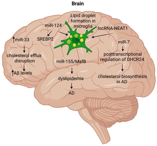 The brain holds nearly 25% of the body’s total cholesterol, with about 70–80% localized in myelin, where it plays an essential role in insulation [316]. MiRNAs such as miR-33 overexpression disrupts cholesterol efflux and elevates extracellular Aβ levels by enhancing its secretion and reducing its clearance in neural cells [124]. MiR-124 regulates SREBP2 levels and lipid droplet formation in microglia [184]. Knockdown of lncRNA-NEAT1 prevents post-stroke lipid droplet agglomeration in microglia by regulating autophagy [236]. MiR-155/MafB axis also contributes to dyslipidemia and atherosclerosis in cerebrovascular disease, which is one of the AD-related modifiable risk factors [150]. MiR-7 controls cholesterol biosynthesis through posttranscriptional regulation of DHCR24 expression in AD [193]. These disruptions position ncRNA–lipid crosstalk as a pivotal axis in neurodegenerative pathogenesis and a potential biomarker/therapeutic target (Figure 5).