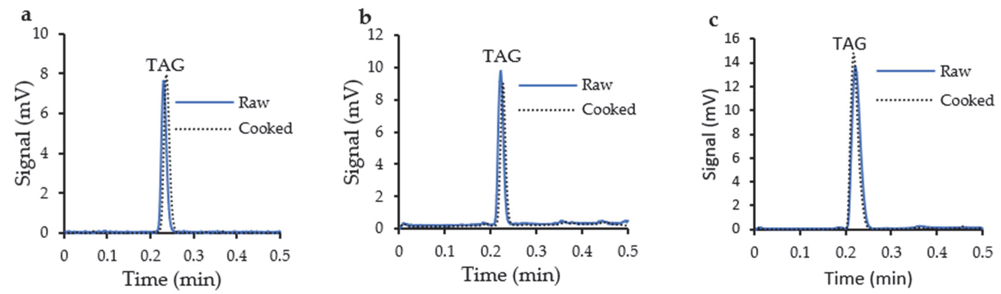| Cooked | 1.19 ± 0.05 b | 9.84 ± 0.88 a | 3.22 ± 0.67 a | 2.50 ± 0.23 a | 6.19 ± 0.45 a | |