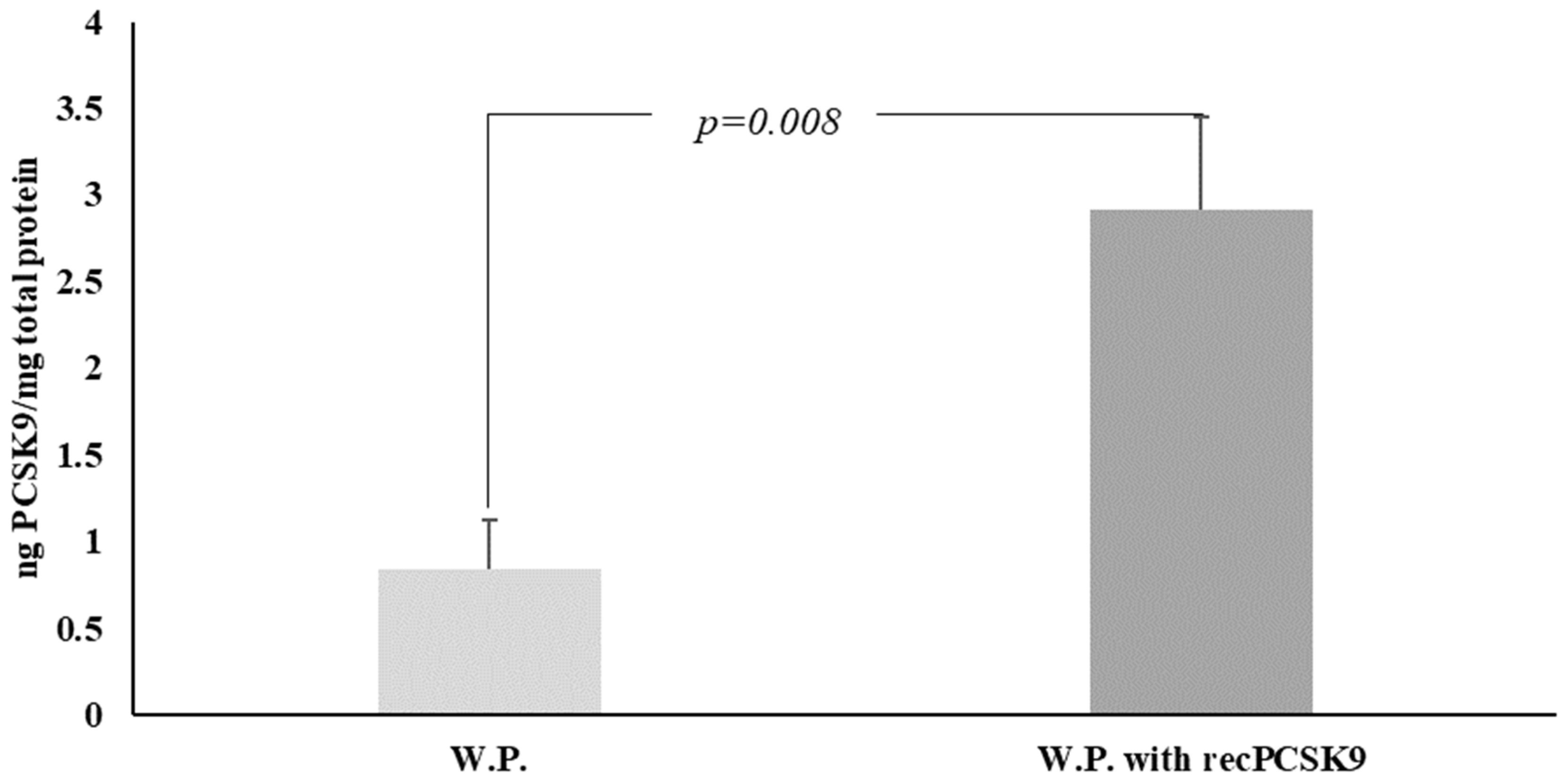 Part of the WP suspension prepared from healthy volunteers was pre-incubated with a 500 ng/mL recPCSK9 solution in sterile PBS (pH = 7.4) for 5 min at 37 °C in the absence of calcium chloride, then solubilized with the NP-40 lysis buffer, as described above. The samples were then centrifuged for 12 min at 975× g and the protein content as well as the PCSK9 levels of the supernatant were determined, as described below, using BCA and ELISA methods, respectively.