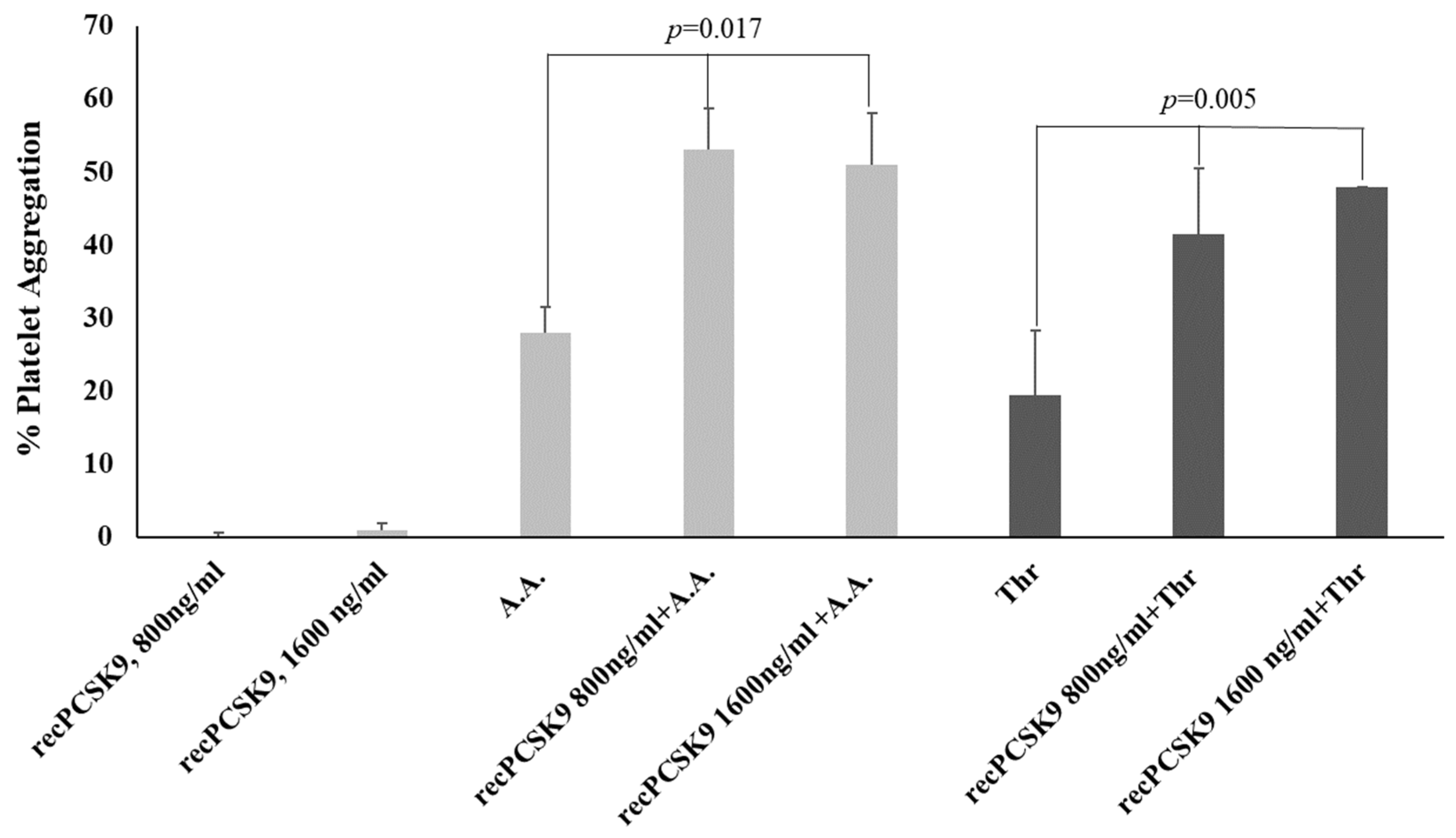 Therefore, the aim of the present study was to quantify PCSK9 levels in human platelets isolated from normolipidemic volunteers, both before and after incubation with recombinant PCSK9 (recPCSK9), in order to assess the platelets’ capacity to absorb circulating PCSK9. Furthermore, we investigated the effects of recPCSK9, as well as PCSK9 associated with LDL and HDL particles, on platelet aggregation responses induced by various physiological agonists. These experiments aim to provide novel insights into the role of PCSK9 in platelet function and its potential contribution to the thrombo-inflammatory processes underlying cardiovascular disease.