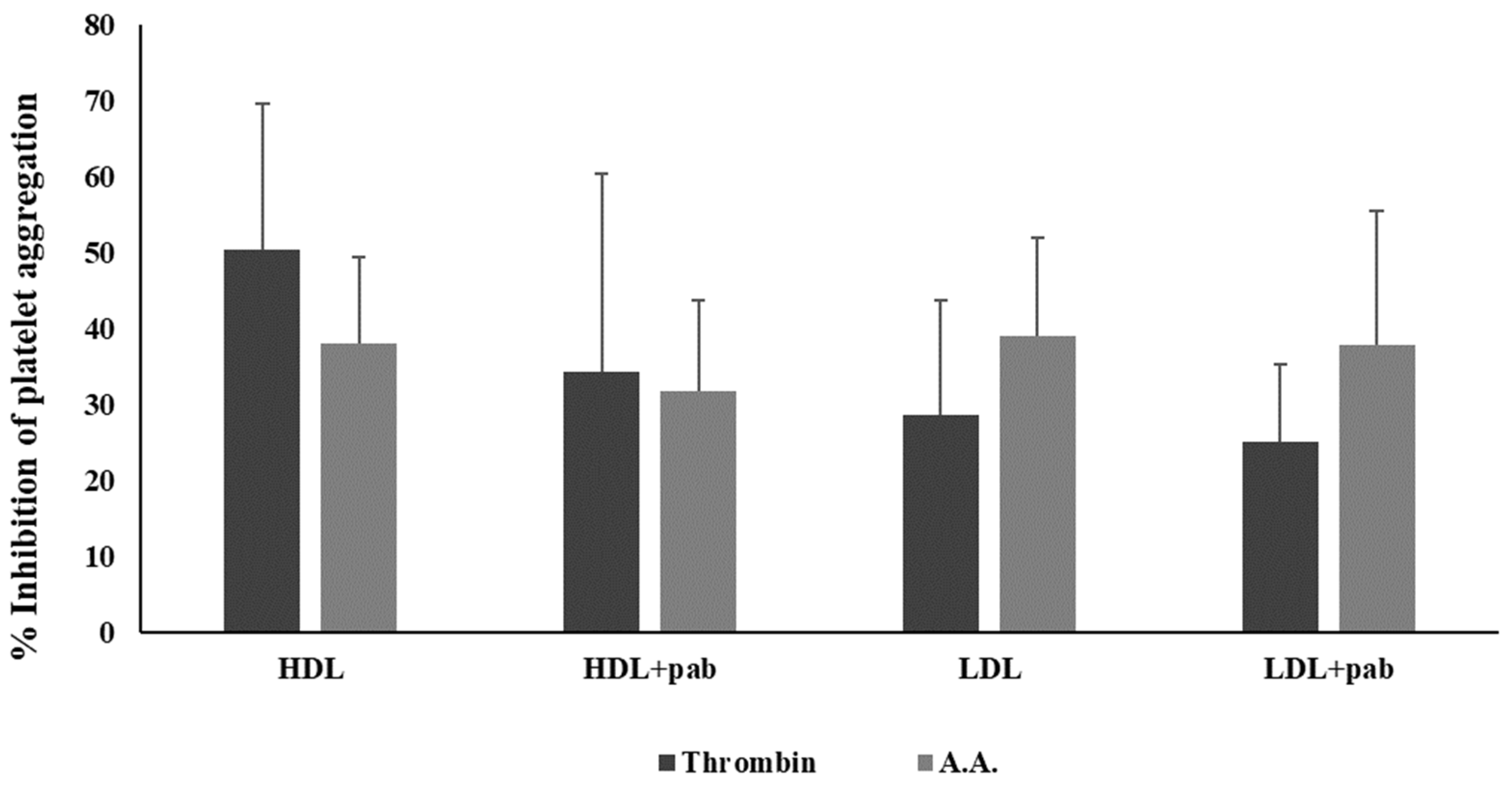 Light transmittance aggregometry (LTA) was performed using a Chrono-Log Lumi-Aggregometer model 700-4DR (Havertown, PA, USA) with the AggroLink (ver. 8.0) software package. LTA was performed on washed platelets using 0.01–0.1 units/mL thrombin and 0.25–0.5 mM ΑΑ as agonists. In certain experiments, platelet aggregation was studied in WPs incubated with exogenous (500, 800 or 1600 ng/mL) recPCSK9 for 5 min or in the presence of 0.1 mg/mL LDL or HDL for 5 min before the addition of the agonists. In other experiments, WPs were incubated for 5 min with LDL or HDL that had been preincubated for 5 min with 1.25 μg/mL of an anti-PCSK9 polyclonal antibody.