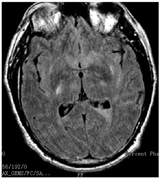 On hospital day 3, he complained of diplopia. A magnetic resonance image (MRI) of his brain was obtained, revealing several areas of mild diffuse leptomeningeal enhancement, as well as restricted diffusion within the posterior horns of the lateral ventricles (Figure 2) and frontal subcortical region, consistent with meningitis with ventriculitis. A lumbar puncture was performed, revealing a white blood cell count of 3640 cells/mcL (normal 0–5 cells/mcL), a red blood cell count of 135 cells/mcL (normal 0–5 cells/mvL), a protein level of 300.5 mg/dL (normal 15–40 mg/dL), and a glucose level of <10 mg/dL (normal 50–80 mg/dL). His final blood cultures, confirmed by the California Emerging Infections Program, which performs active bacterial core surveillance for our county, grew Neisseria meningitidis (serotype unavailable). Transthoracic echocardiography did not reveal a significant pericardial effusion; thus, no pericardial fluid sample was obtained. He was continued on ceftriaxone for two weeks and colchicine for three months. The Department of Public Health was notified so that the patient’s family, hospital staff, and the patient’s coworkers were able to receive post-exposure chemoprophylaxis for meningococcal infection. Additional information included that the patient revealed that he had not received a meningococcal vaccine in the past. Clinic visits from two months after discharge showed full and complete recovery, including the absence of diplopia. His final diagnosis was disseminated meningococcal infection involving the pericardium, myocardium, and meninges (i.e., meningococcal myopericarditis).