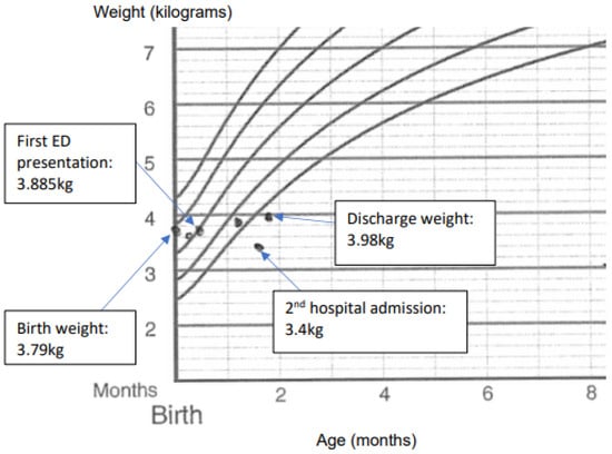 Baby Z, a 5-week-old term male, presented to the Emergency Department (ED) with two days of watery diarrhoea and lethargy. Baby Z was feeding well on mixed breastmilk and formula feeds with an adequate urine output and no fevers or vomiting. Baby Z examined well with a weight of 3.885 kg (birth weight 3.79 kg) in the ED (Figure 1), a blood glucose level of 6.6 mg/L, and a ketone level of 0.3 mmol/L and was discharged from the ED with a diagnosis of infectious diarrhoea.
