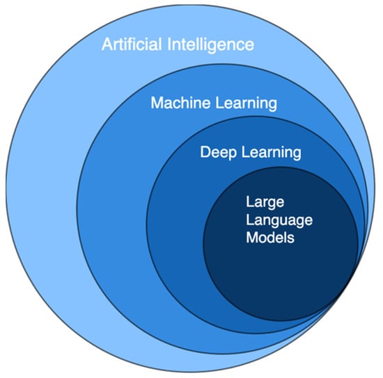 AI is broadly defined as the development of intelligent computer systems that are able to perform tasks in which human intelligence is typically required, imitating human decision-making processes and behaviours [55]. To accomplish this, different approaches and algorithms have been explored for various applications. For example, discriminative AI models utilise algorithms such as logistic regression and decision trees to identify and classify input data, whereas generative AI makes use of neural network models such as Generative Adversarial Networks (GAN) and transformers to generate new data [56]. Machine learning, a subset of AI, aims to develop systems that can learn and provide improved outputs from exposure to additional data over time, without being explicitly programmed to do so [57]. That is, machine learning models make predictions and decisions on new, unseen data, based on previously seen data that the model was trained on. Deep learning is a more advanced form of machine learning, in that it requires less human intervention. Where machine learning techniques usually necessitate manual human labelling of data prior to training, deep learning algorithms are able to extract relevant features from data automatically [58]. LLMs are a specific application of generative AI that exist as a subset of deep learning models [59]. Figure 1 visualises the AI taxonomy, in which machine learning, deep learning and LLMs are subsets of their former [60].