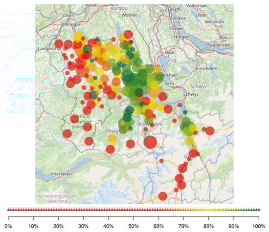 Planning the teams across cantons offered advantages for operational reasons: the DES predicted resource-neutral optimization potential for Central Switzerland of 0.9 percentage points (from 80.4% to 81.3%) with respect to overall response time compliance rate. This improvement was not fully realized in the following year with a real increase of 0.5 percentage points (from 79.6% to 80.1%). In addition, the DES showed a decrease in overtime by 300 h per year by improving dispatching strategies and shift times through, e.g., avoidance of the dispatch of teams close to the end of a shift. This was implemented and improvements were confirmed one year later. The DES revealed further benefits concerning employee satisfaction: joint planning made it possible for employees to choose between different deployment areas (urban–rural). The clustering in Figure 2 corresponds to communities, i.e., more or less a postal code. The area with a high response time compliance rates (green circles) includes the city of Lucerne, whereas the rural area is difficult to cover.