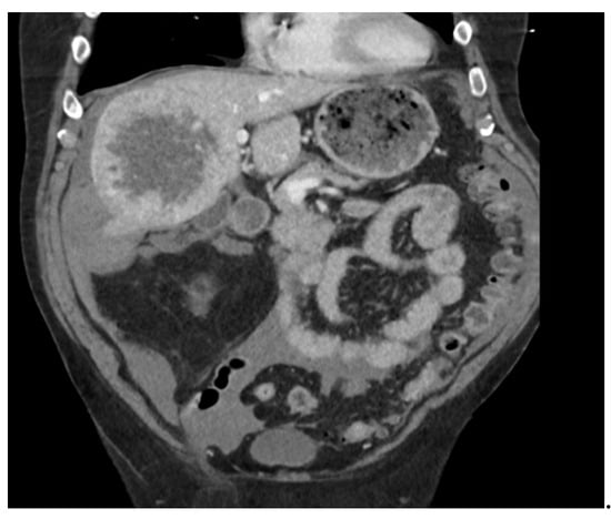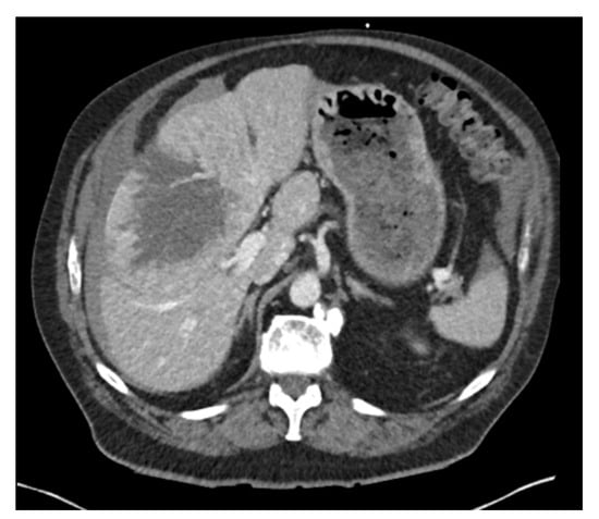 The initial presentation of non-ruptured HCC is frequently asymptomatic, with symptoms manifesting only when the disease progresses [4]. These symptoms include diffuse abdominal pain, typically located on the right side of the patient’s abdomen. As the disease advances, symptoms such as icterus, weight loss, loss of appetite, and asthenia may become evident [4]. Spontaneous capsular rupture as a consequence of HCC progression is a rare phenomenon; a retrospective study of 1451 HCC patients identified 57 cases (3.9%) of spontaneous rupture [1]. This complication is associated with a high mortality rate caused by often difficult-to-control hemorrhaging. This condition is frequently diagnosed late due to the absence of symptoms in the early phase of the disease, particularly for patients with no known progressive cirrhosis [6]. The prognosis for HCC that has ruptured is worse than for non-ruptured cases. This is due to the greater extent of intraperitoneal hemorrhaging observed with the ruptured capsules [7]. It is noteworthy that spontaneous capsular rupture ranks as the third leading cause of death among HCC patients, surpassed only by tumor progression and liver failure [4,8,9].