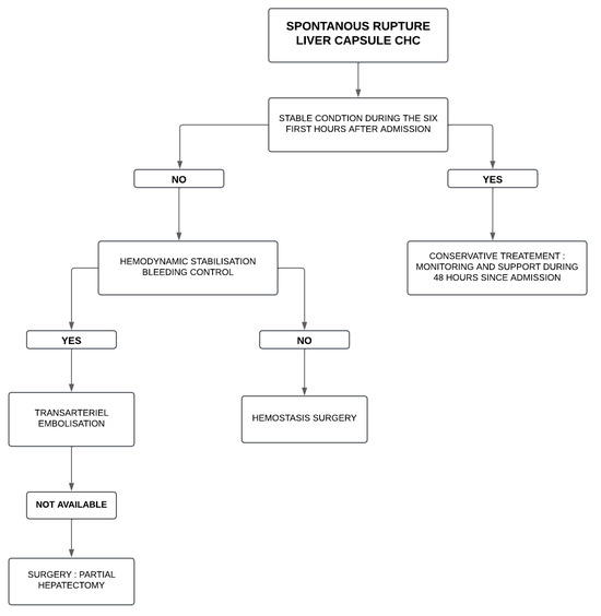 Initial patient management consists of restoring hemodynamic stability—with the administration of volemic resuscitation—and bleeding control. The management of hemorrhagic shock and specific HCC treatment are beyond the scope of this article. Once the patient has been stabilized, the following treatment options may be considered to halt the progression of the active bleeding caused by the capsular rupture. These include transcatheter arterial embolization (TAE), hemostasis surgery, and liver resection [1]. In two recent studies by Kang et al. and Kirihata et al., the two reference treatments were TAE followed by surgery [6,7]. Other treatments cited in the literature include radiofrequency or Yttrium-90 embolization, cryosurgery, and percutaneous ethanol injection (PEI) [10]. Current data do not allow for any conclusions to be drawn regarding the benefits of these treatments. Treatment choice depends on the severity of the clinical picture, the progression of the oncological disease, and the patient’s general condition. A conservative attitude can be advisable based on hemodynamic, clinical, and biological monitoring [10]. In the event of deterioration during the initial phase—arbitrarily set at between 6 and 48 h after the onset of capsular rupture—TAE is frequently the primary treatment if the patient is hemodynamically stable [11]. The serum bilirubin level, the presence of shock, liver deficiency, and tumor characteristics have been identified as prognostic factors for survival following TAE [6]. When TAE is not an option, hemostatic surgery can be considered as a viable alternative. This approach involves surgical resection at a subsequent date (first-look versus definitive), contingent on the tumor’s size and extension as well as the surgeon’s expertise [8]. Liver transplantation does not seem to be a rational alternative given such patients’ generally fragile state at the time of presentation and the frequently advanced stage of the disease at the time of diagnosis [10]. As illustrated in Figure 3, a decision-making algorithm has been developed for managing liver capsule rupture in HCC progression, emphasizing the need for a multidisciplinary approach.