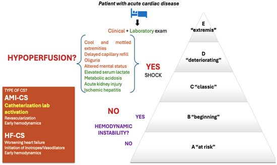 - Shock classification based on required therapeutic interventions: Patients needing vasoactive drugs or MCS for hypoperfusion or hemodynamic compromise are classified as stage C. If additional vasoactive drugs or MCS devices are required, the patient progresses to stage D. If perfusion cannot be restored with multiple therapies or extremely high doses of vasoactive drugs are necessary, the patient is classified as stage E [21].