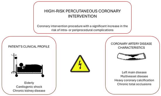 High-risk PCI is defined as a coronary intervention procedure with a significant increase in the risk of intra or periprocedural complications due to the patient’s clinical profile, anatomical characteristics, or a combination of both [56,57] (Figure 2). In contrast, complex angioplasty specifically refers to cases where the coronary anatomy poses a significant technical challenge for the interventional cardiologist. These characteristics may include severe coronary calcifications, a high thrombus burden, marked arterial tortuosity, or the presence of chronic total occlusions. Successfully managing these conditions often requires the use of advanced techniques (e.g., plaque modification techniques such as rotablation or intravascular lithotripsy) and intracoronary imaging techniques such as optimal coherence tomography (OCT) or intravascular ultrasound (IVUS) [57,58]. In high-risk PCI, all anatomical and clinical factors involved should be carefully evaluated. This approach allows for the design of an optimal strategy that ensures the best outcomes and patient safety. CAD anatomical characteristics represent the most variable and technically challenging factor. These include multi-vessel disease, unprotected left main CAD, chronic total occlusions, extensive lesions (>60 mm), and severe calcifications [59]. Comorbidities such as chronic kidney disease, advanced age, or peripheral vascular disease significantly impact both short and long-term prognosis. However, the patient’s hemodynamic status, particularly in cases of CS, plays a crucial role in determining both prognosis and therapeutic approach, as timely intervention becomes critical [27].