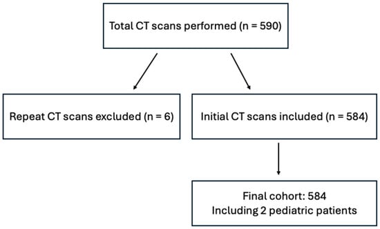Patient consent was waived due to the Institutional Review Board at North Zealand Hospital deemed the need for patients’ consent to participate in the current study unnecessary, because the CT scan data were processed anonymously, and the scope was to assess departmental health care quality. The aggregated quality data may subsequently be freely used for further research. This is in accord with the Danish Health Care Act (dk: Sundhedsloven) (https://www.retsinformation.dk/eli/lta/2024/247, accessed on 10 May 2025).