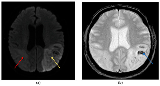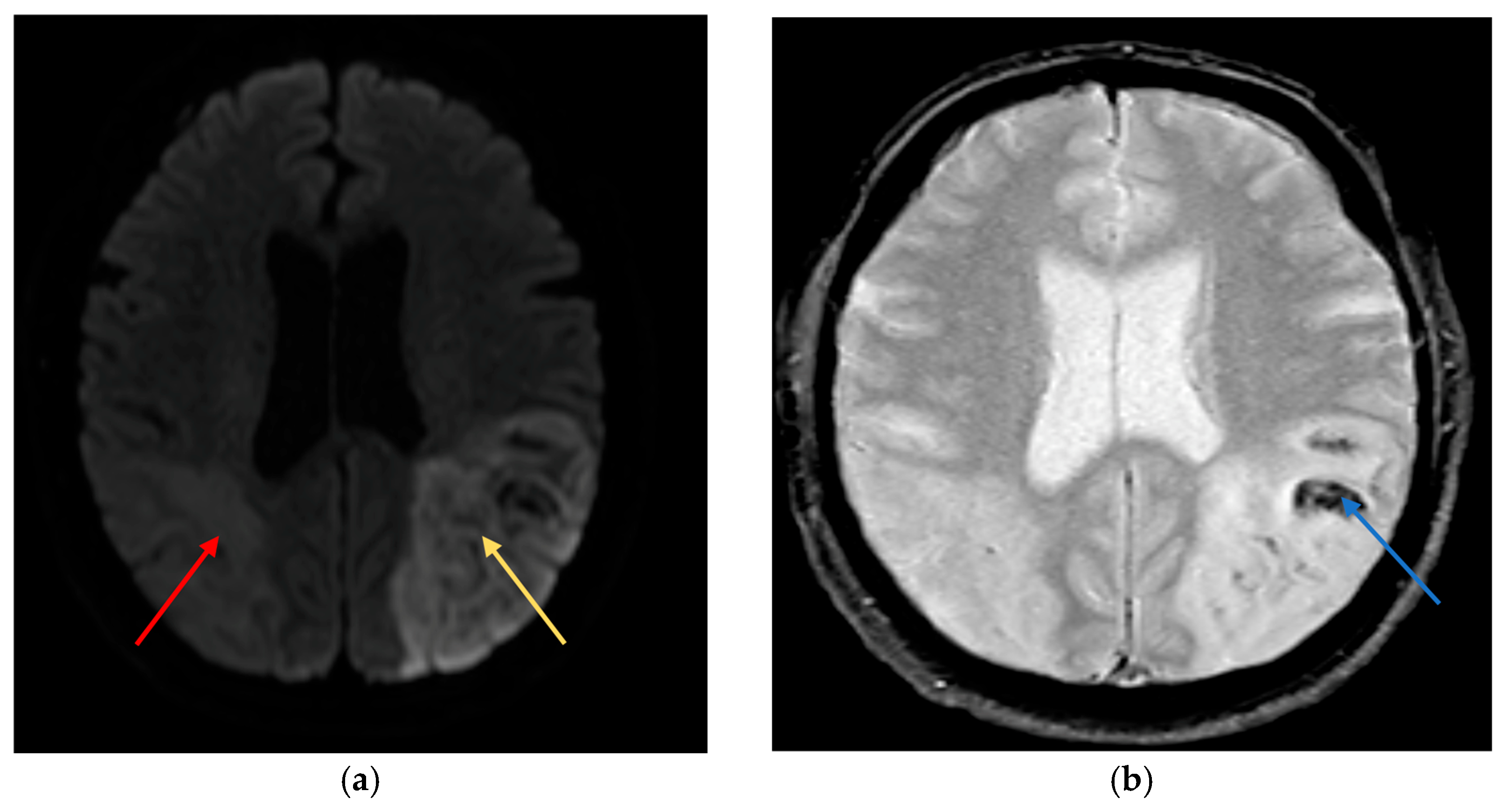 Figure 2a), the infarcted regions aligned with cortical areas subserving symbolic representation and spatial mapping. Notably, the haemorrhagic transformation (