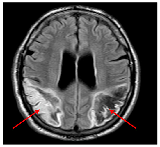 Follow-up contrast-enhanced MRI confirmed stable bilateral parietal infarcts with no evidence of new lesions (
