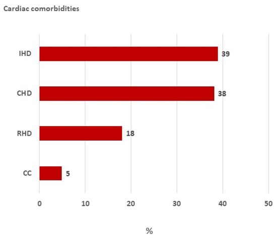 Distribution of cardiac comorbidities among the patients included in this study. CC: compound comorbidity; RHD: rheumatic heart disease; CHD: congenital heart disease; IHD: ischemic heart disease.