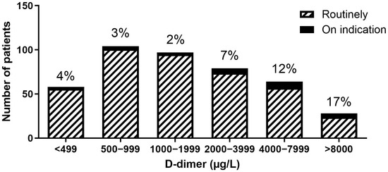 D-dimer levels were >500 µg/L in 351 (86.2%) patients and above the age-adjusted value in 284 (69.8%) patients (Table 1, Figure 2). Consequently, the cohort was categorized as follows: 123 patients (30.2%) with D-dimers < AADD, 129 patients (31.7%) with D-dimers ≥ AADD-2000 µg/L, and 155 patients (38.1%) with D-dimer ≥ 2000 µg/L (Table 2). Physicians requested D-dimer levels in 23 patients (5.7%) and the proportion of requested (on indication) D-dimer tests were higher when D-dimer levels exceeded 2000 µg/L (Figure 2; 2.8% vs. 10.3% for <2000 vs. ≥2000 µg/L resp.).