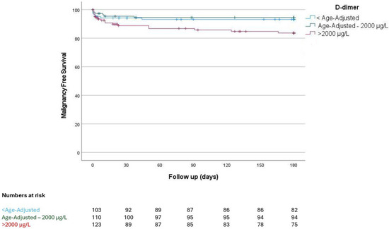 Kaplan–Meier curves showed that the malignancy free survival was lower in patients with D-dimer ≥ 2000 µg/L than in patients with D-dimer < AADD and D-dimer ≥ AADD-2000 µg/L (log-rank test p = 0.02, Figure 3).