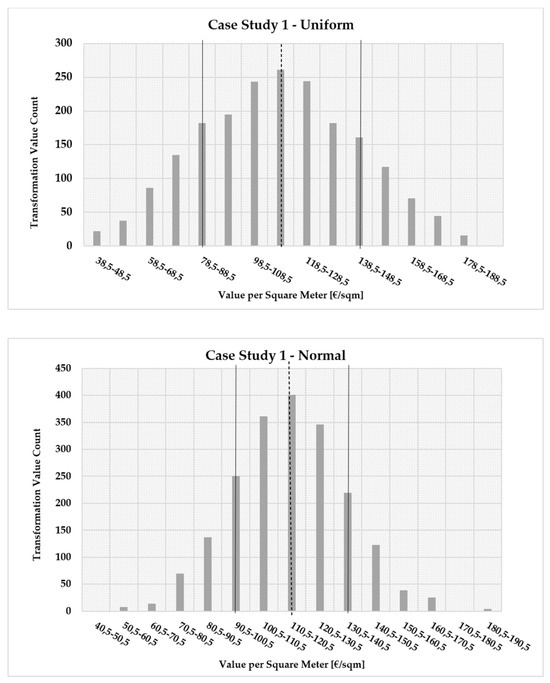 The primary outcome of the MC simulations is the estimated TV for each case study. Table 4 presents the TV under both Uniform and Normal probability distribution models. Table 4 reports the average TV, the unit TV (in terms of €/m2), and the probability of obtaining a TV within 10% range of the mean value.