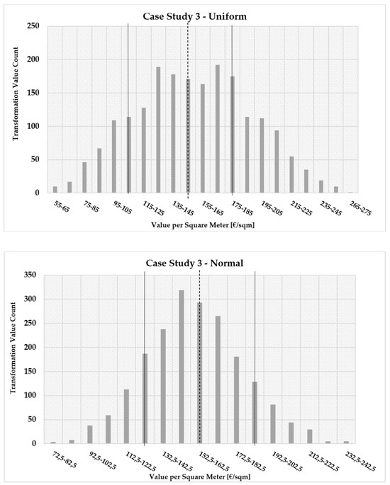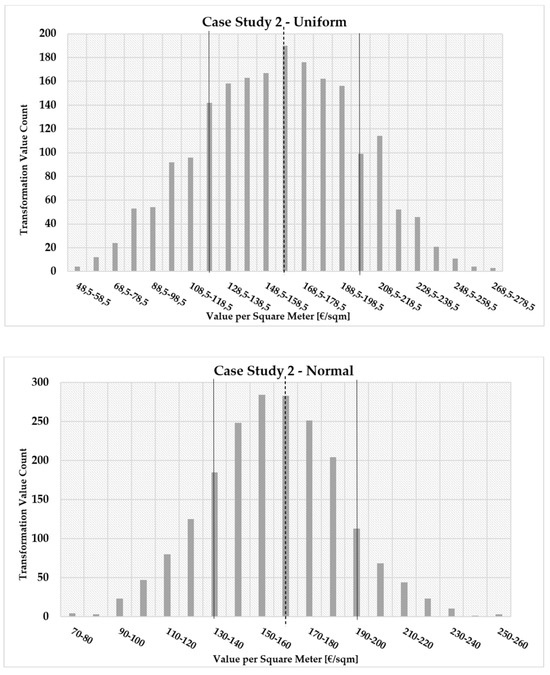 Distribution of per m2 in Uniform (top) and Normal (bottom) models—Case Study 3.