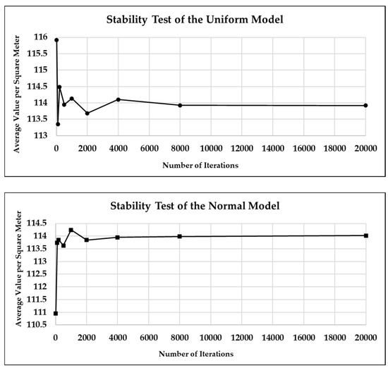 As shown in Figure 6, the average unit TV in both models fluctuates within a narrow range, approximately between 113.5 and 116 €/m2 in the Uniform model, and between 111 and 114.5 €/m2 in the Normal model. These results indicate that the two models display consistent behavior, with minimal variation as the number of iterations increases.
