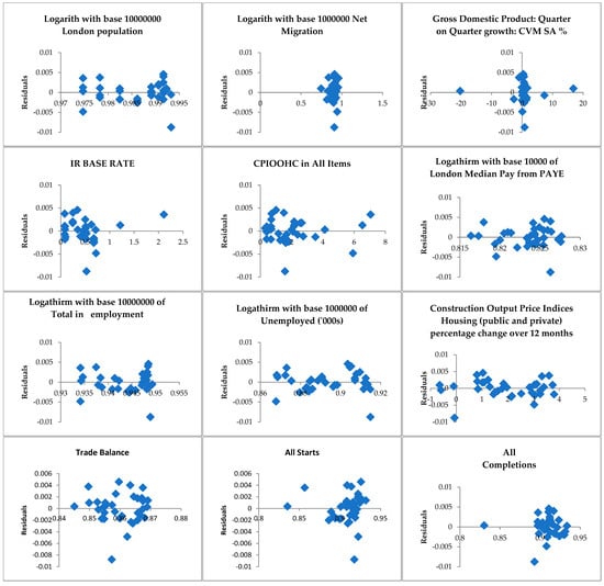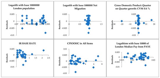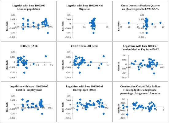 Descriptive statistics were employed to identify each independent variable’s mean, the standard deviation and the coefficient of variation as adopted in studies of [32,33]—descriptive statistics in Table A2—which identified that the mean values of London Median Pay were substantially lower compared to the London House Price Index and House Price Index in all property types, evidently confirming the reliance on financing on home purchases, while base interest rates enhance the sensitivity on London House Prices in relation to London median pay.