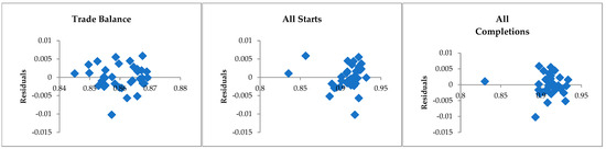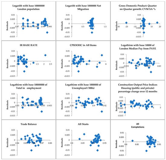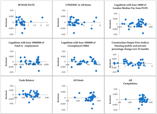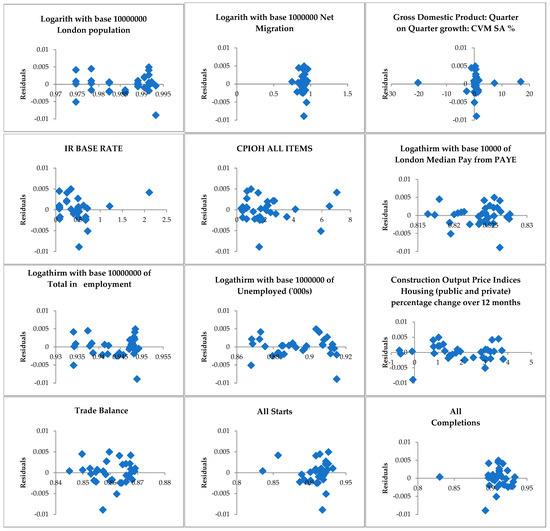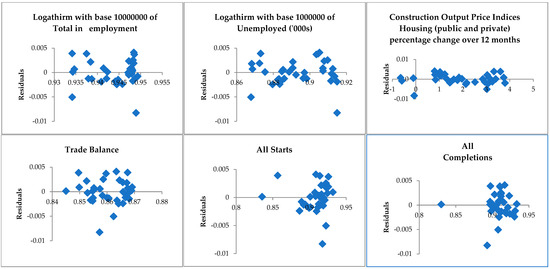Applying the coefficient of variation as shown in Table A3 identified this study’s data with the highest variability around the mean. Among those were the GDP Quarter on Quarter Growth (1034%), the Trade Balance (−166%), the ‘consumer price index occupiers’ housing costs in all items’ (97%), and the Interest Rate Base Rate (94%) which vary substantially over time causing inaccuracy on the estimations.