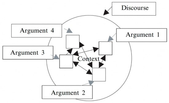 In this discourse analysis, we draw inspiration from argument-based models by Toulmin [70], Gasper and George [71] and especially Kumar and Pallathucheril’s [9] contextual model, portraying discourse as a constellation of arguments (see Figure 1). These frameworks are employed systematically to classify each argument into its components—claim (C), grounds (G), warrants (W), and, where relevant, backings, qualifiers, and rebuttals. This structure provides a basis for understanding how urban planners and decision-makers rationalize their choices within institutional settings. According to Kumar’s [9] model, understanding the contextual nature of discourse requires recognizing the setting in which it occurs, the communicative and social roles of participants, the norms and values, and any institutional or organizational structures [9].
