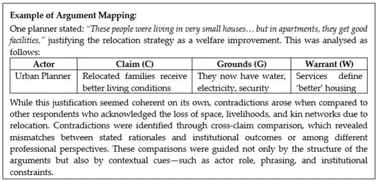 This qualitative study analyzes the discourse surrounding postwar public housing in Sri Lanka. It is based on the idea that human experiences and argumentative discussions, relying on claims and their support, play a crucial role in constructing meaningful discourse. The concept of discourse is complex and has many meanings [9]. In urban planning, discourse can hardly be captured solely through linguistic or content analyses that focus on textual patterns. According to Kumar [9], discourse is a higher-order construct that subsumes multiple arguments and argumentative threads. It includes diverse interactions among individuals, such as conversations and debates conducted through language—written or spoken—within a specific setting and towards a certain end [9,68]. Thus, discourse represents a broader exchange of ideas and viewpoints among various individuals in a particular situation. Conversely, an argument, as defined by van Eemeren et al. [69], is a reasoning activity concerning a specific proposition. Each argument has a distinct intent: to inform, confront, support, or persuade [9].