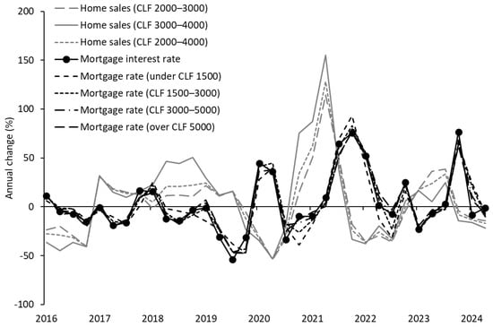 Figure 1 illustrates the substantial fluctuations in mortgage rates, with periods of increasing rates corresponding to subsequent declines in housing sales and, conversely, periods of significant rate reductions associated with eventual increases in sales. For instance, home sales within the CLF 2000–3000 range exhibited annual growth rates of 51%, 114%, and 49% during the first three quarters of 2021. Similarly, housing demand in the CLF 3000–4000 range recorded annual increases of 75%, 87%, and 155% between the fourth quarter of 2020 and the second quarter of 2021. Notably, during this period, the mortgage rate experienced a cumulative quarterly reduction of 53 basis points between the third quarter of 2020 and the first quarter of 2021, in addition to a cumulative decrease of 117 basis points in 2019.