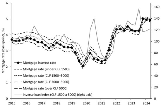 From the previous analysis, it is evident that mortgage rates exhibit negative covariance with loan amounts, a relationship that is economically rational. In general, an increase in the interest rate renders loans more costly for borrowers, thereby discouraging borrowing and establishing an inverse relationship between loan placements and interest rates. This principle applies when the interest rate decreases. In this context, Figure 3 demonstrates the strong correlation between mortgage rates and the inverse of housing loans within the CLF 1500–5000 segment, presenting this last variable as an index to facilitate comparative analysis. Additionally, Figure 3 highlights a notable reduction in the dispersion of mortgage rates across credit segments during the period of sustained interest rate increases (post-2021) in contrast to the greater heterogeneity observed in the years preceding the 2020 pandemic.
