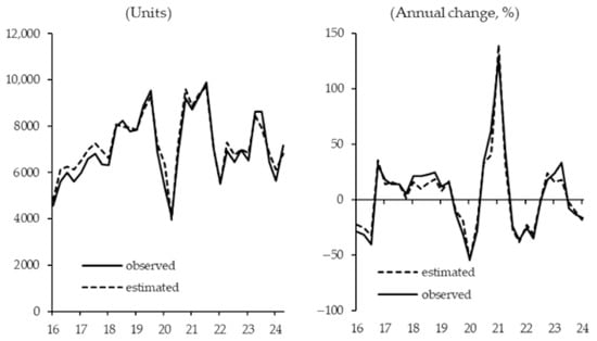 where is the interest rate for mortgage loans, commonly referred to as the mortgage rate. Additionally, reflects the anticipated future rate contingent upon the information set available in time . The variable corresponds to the Chilean per capita Gross Domestic Product. pertains to mortgage placements ranging from CLF 1500 to 5000. The variable represents the demand for housing within the price range of CLF 2000–4000. The lag represents the transaction costs inherent in the market, illustrating the persistence or inertia observed in home sales. Furthermore, with corresponds to endogenous shocks associated with the interest rate, housing demand, per capita GDP, and housing loans, respectively, which enhance the model’s fit. Specifically, can be construed as a risk premium that captures the unobservable effects of sentiment in the financial market. Finally, denotes exogenous shocks introduced into the system.