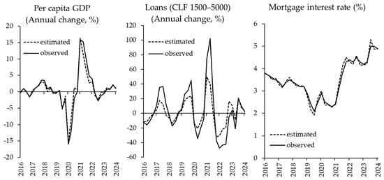 Estimated vs. observed GDP, loans, and mortgage rates.